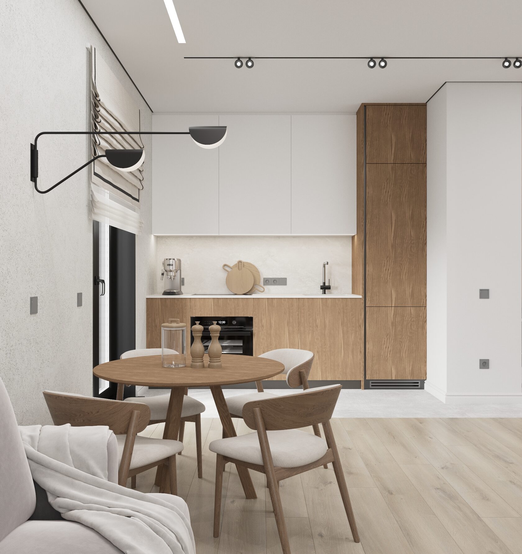 компактная кухня-гостиная объединяет зону отдыха и обеденное пространство